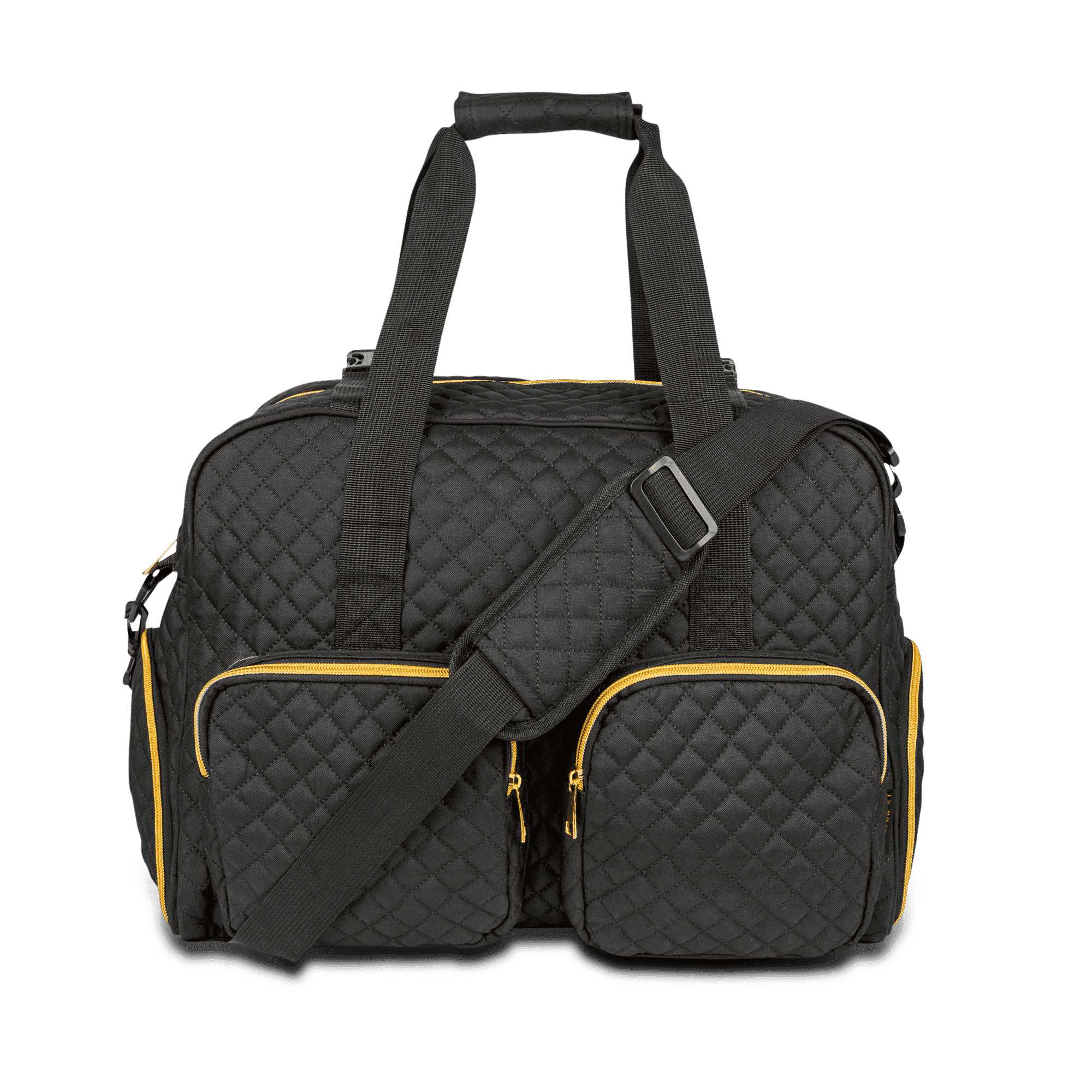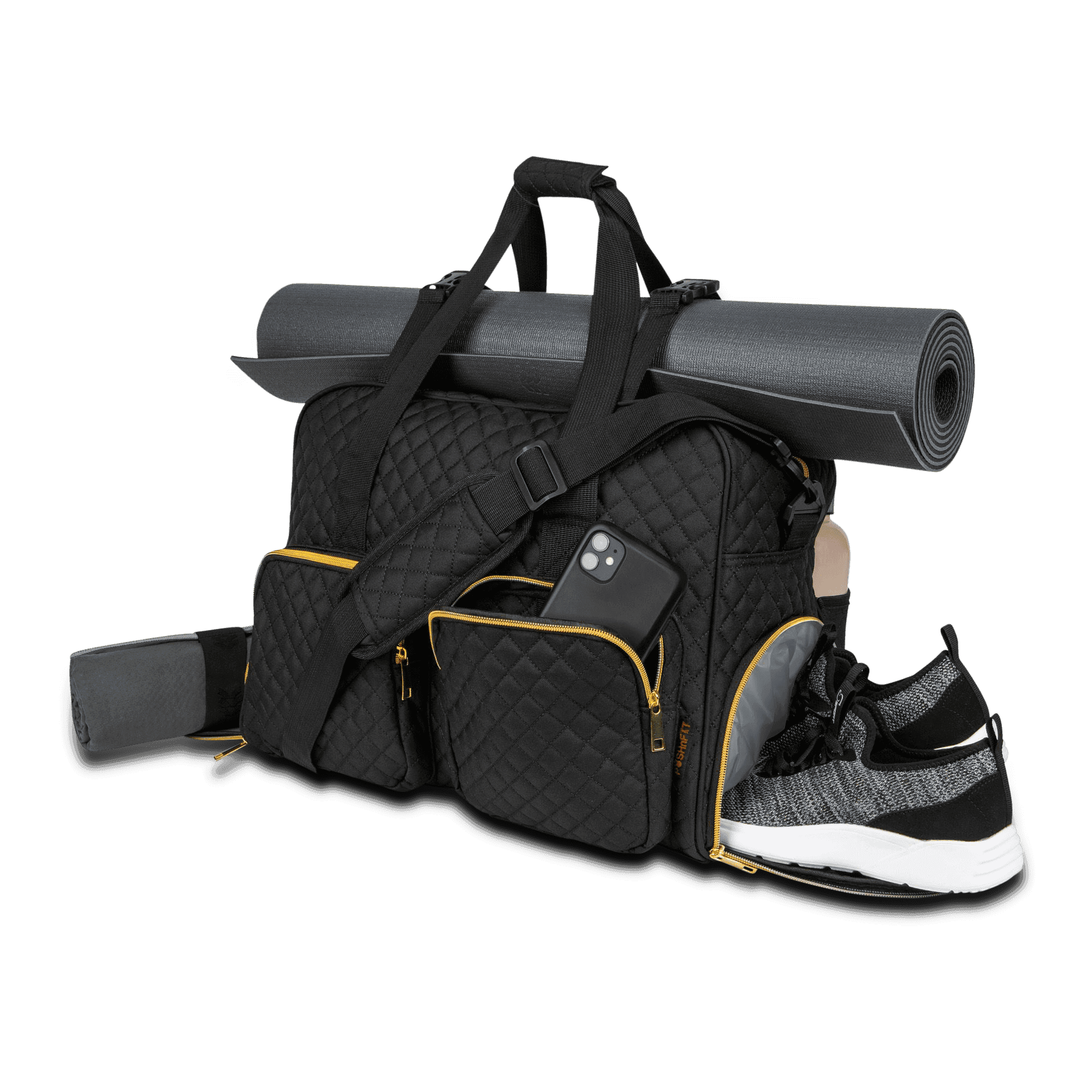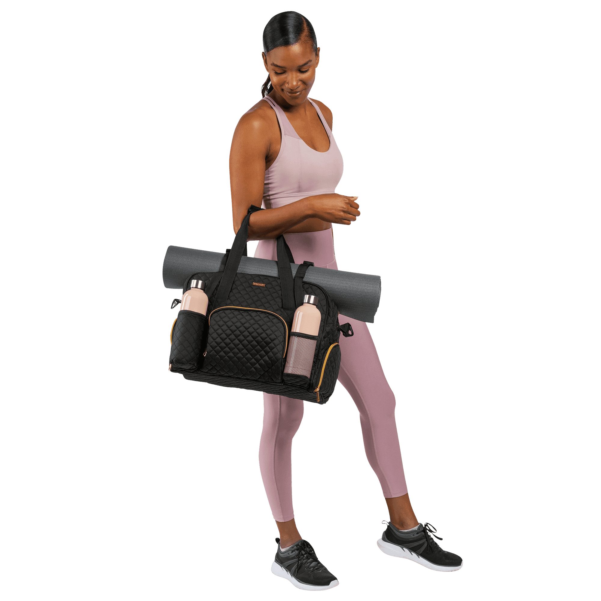 Gym, travel, and all-purpose companion for women. Perfect organization tool. The large main compartment can easily store your gym or travel necessities. Never worry about your shoes touching your clothing again because they have a separate compartment. Worn personal items and damp accessories like swimwear and wash cloths have a waterproof storage pocket. Need a place to store your exercise mat while traveling to the gym or out of town? We’ve got you covered! Store your keys, wallet, id, and cell in either the interior or exterior zippered pockets for quick & easy access. These multiple storage options make this fitness/ travel duffel perfect for the gym, dance, cheer, ballet, soccer, softball, or a variety of other uses. An adjustable & detachable shoulder strap is provided for hands-free carrying. The bag dimensions are 18" x 9" x 12" which is perfect as an airline personal item.
