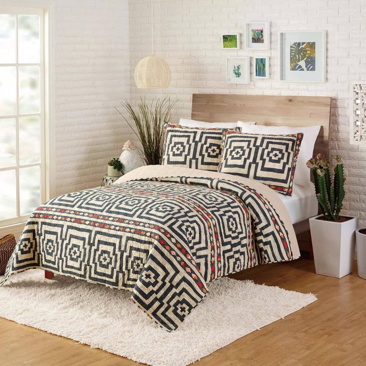 Hypnotic was inspired by a vintage African textile Justina spotted at a market in Paris. The geometric Greek key-like pattern makes this quilt feel classic and ripe for layering to complete the global-modern look.