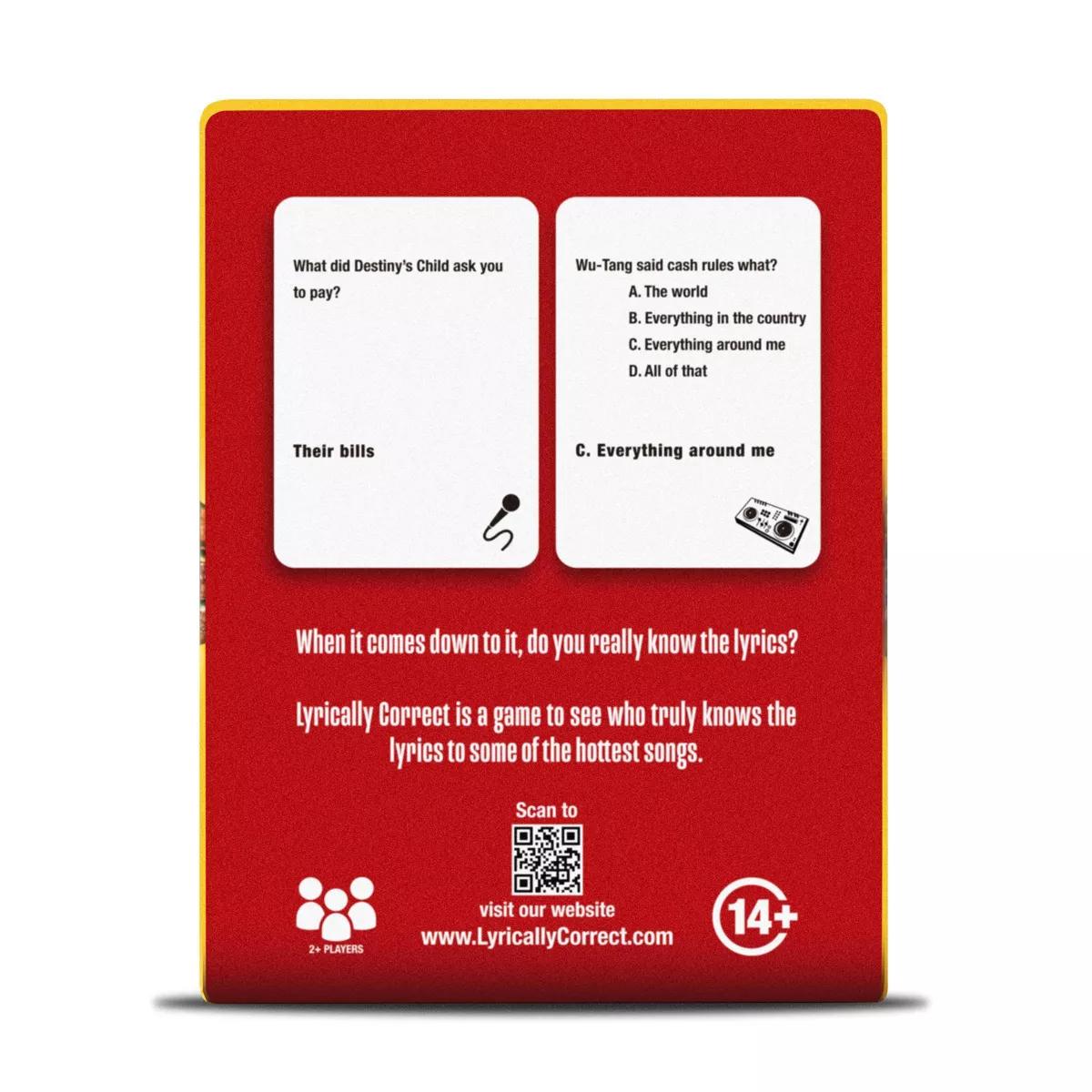 Lyrically Correct is a music trivia card game that tests how well you know the lyrics to some of the hottest songs. This game will have you laughing, arguing, singing, and most of all enjoying time with friends and family.