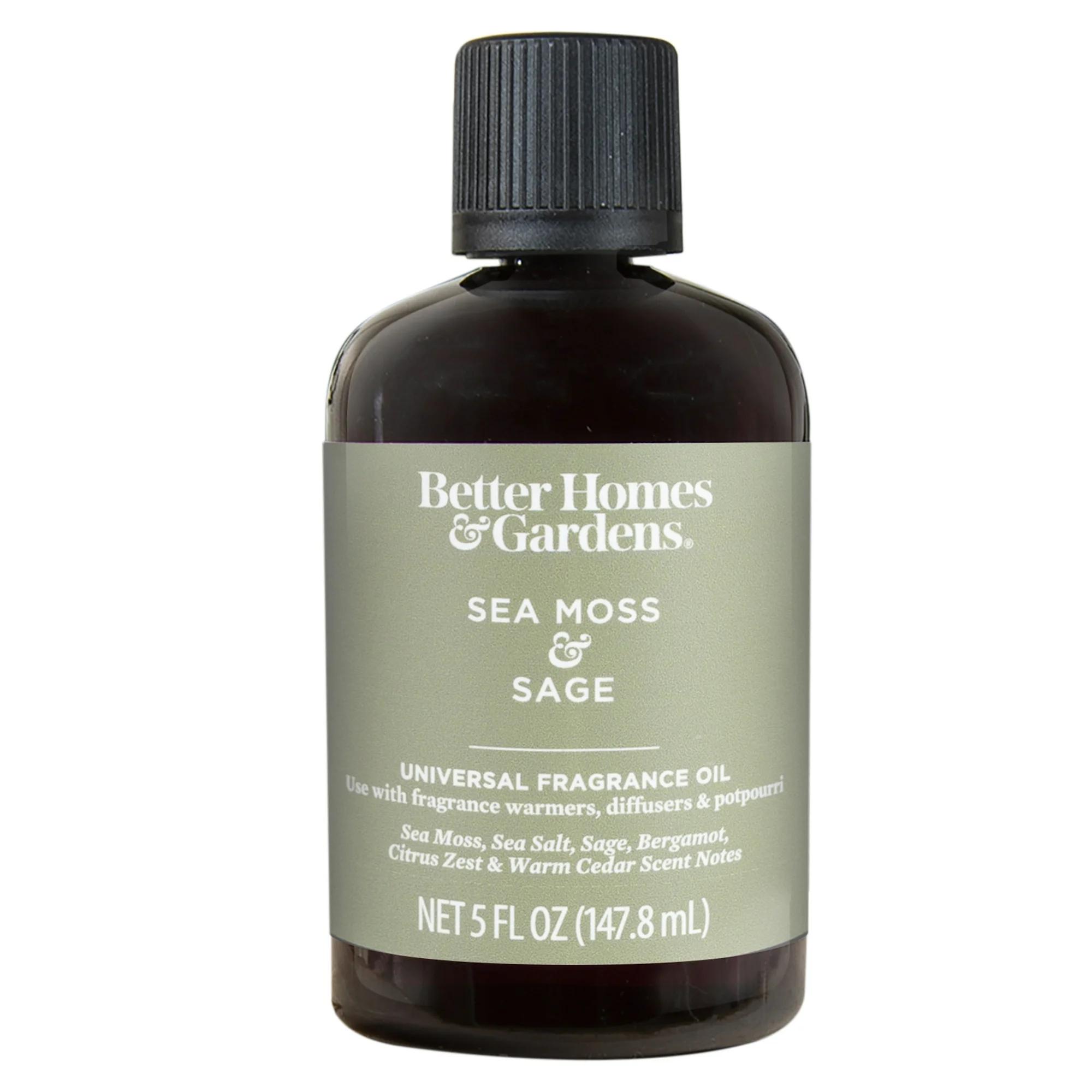 Better Homes & Gardens 5 FL OZ Universal Fragrance Oil Sea Moss & Sage: Enjoy the invigorating scent of Sea Moss & Sage when you choose this Better Homes & Gardens Universal Fragrance Oil. The aromatic combination will leave your home smelling incredible. This Better Homes & Gardens Sea Moss & Sage Universal Fragrance Oil is an intriguing blend of sea moss sea salt sage bergamot citrus zest and warm cedar. Relax in comfort and place your mind and senses at ease when you place this refill in your favorite diffuser. It is perfect for use in any room of your home or office. Just plug in your diffuser and enjoy as the aroma sets a calming atmosphere.