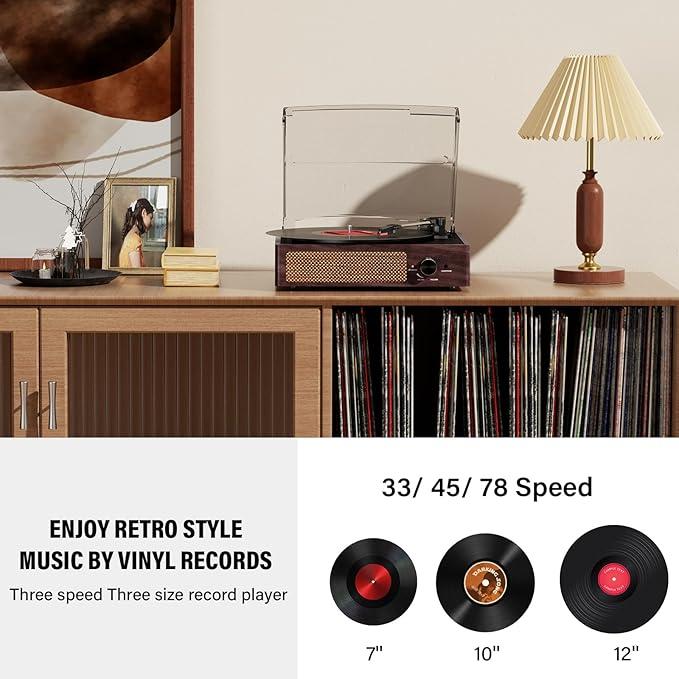 【All-in-one Record Player】Bluetooth input, AUX audio input, RCA line output and headphone jack, easily satisfy your multiple music experiences. Built-in dual stereo speakers, wireless transmission via Bluetooth, let you enjoy smartphone music, fashionable and convenient. Play music directly through AUX, or listen privately with headphones. Connect external speakers with RCA for better sound quality and release your music passion!