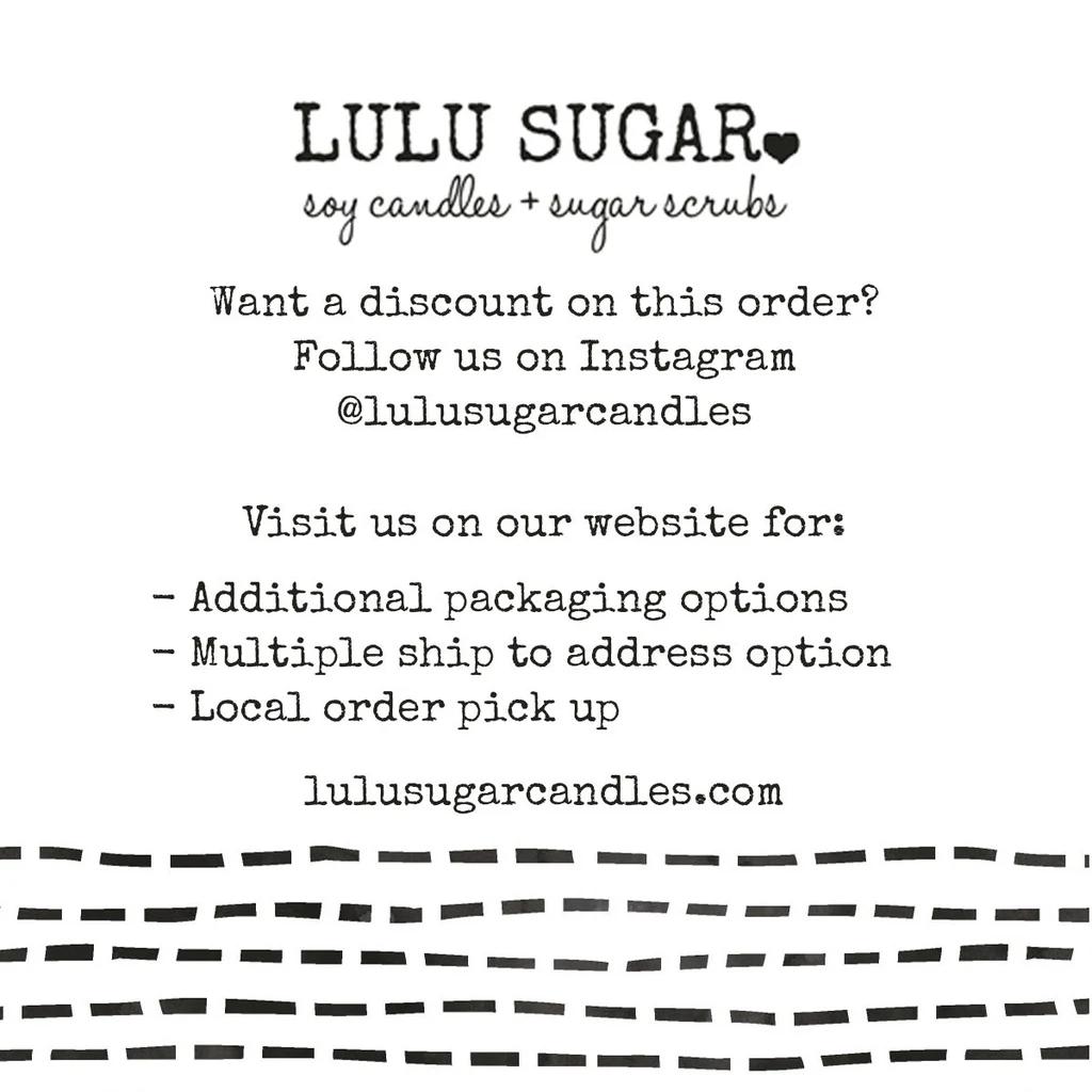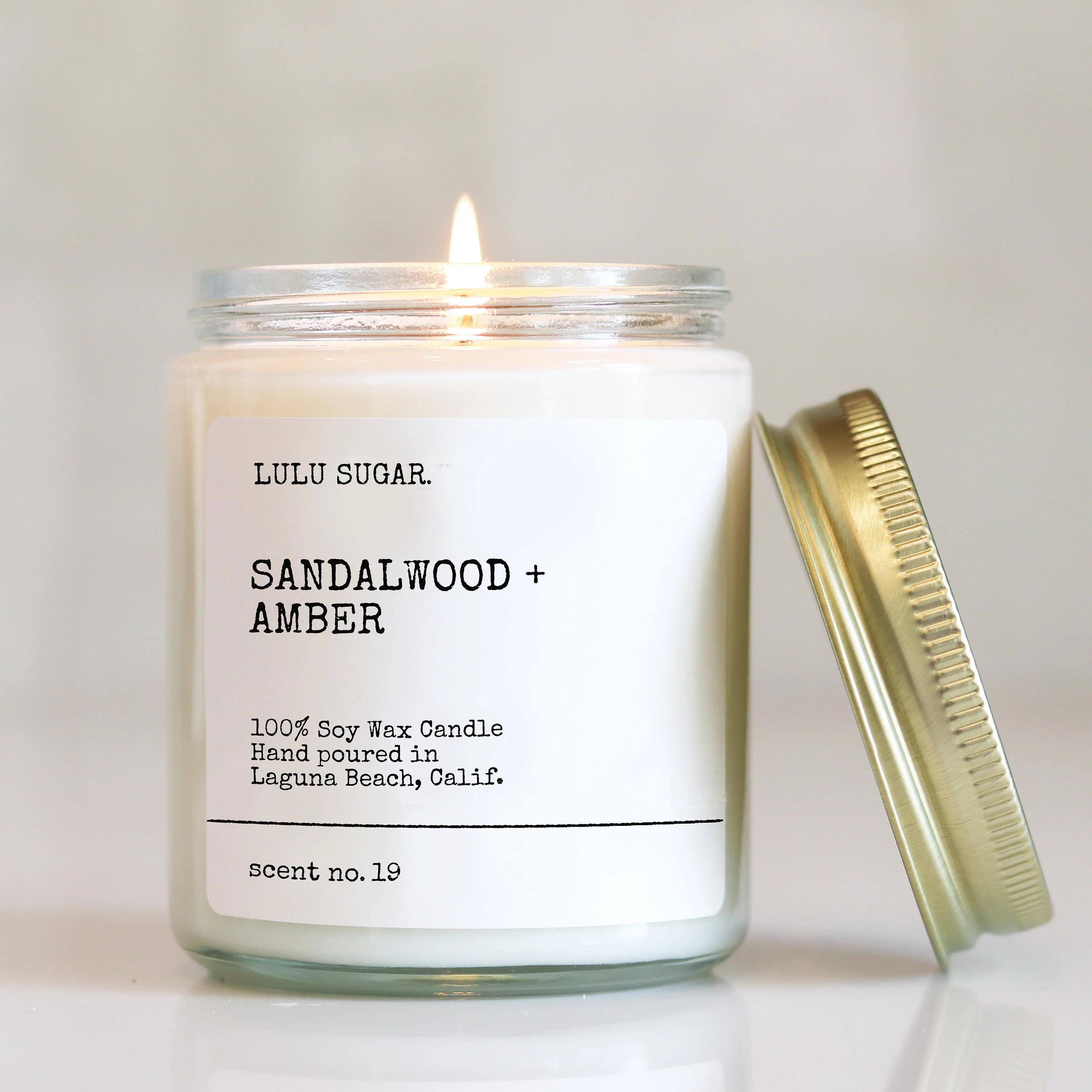 Our Sandalwood + Amber scented candles are made with 100% American grown, eco-friendly soy wax & are scented with clean burning fragrance & essential oils. They are always free of dyes, harsh chemicals & pollutants & are hand poured in our shop in Laguna Beach, California. A clean candle is a better candle, better for you & better for the environment. SCENT NOTES: Sandalwood | Tonka Bean | Amber CANDLE SIZE: 4 fl oz, 2 inches tall X 2.75 inches in diameter 8 fl oz, 3.75 inches tall X 2.75 inches in diameter APPROXIMATE BURN TIME: 4 oz - 20-30 hours 8 oz - 60-80 hours GET THE MOST OUT OF YOUR CANDLE: We suggest a minimum of 3 hours per burn for maximum longevity & even wear. WHAT YOU WILL RECEIVE: 1 - Soy Candle in the scent shown above in the size of your choice. Your candle includes complimentary LULU Sugar matches. OTHER HELPFUL INFO: We ship all candles USPS 2-3 day priority mail. Please check our shop announcement for our current lead time. Shipping is FREE on orders of $35 or more when shipping to one address! Sandalwood + Amber Scented Candle | Soy Woody Earthy