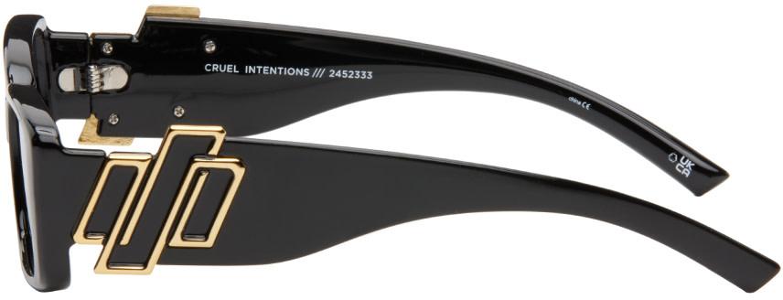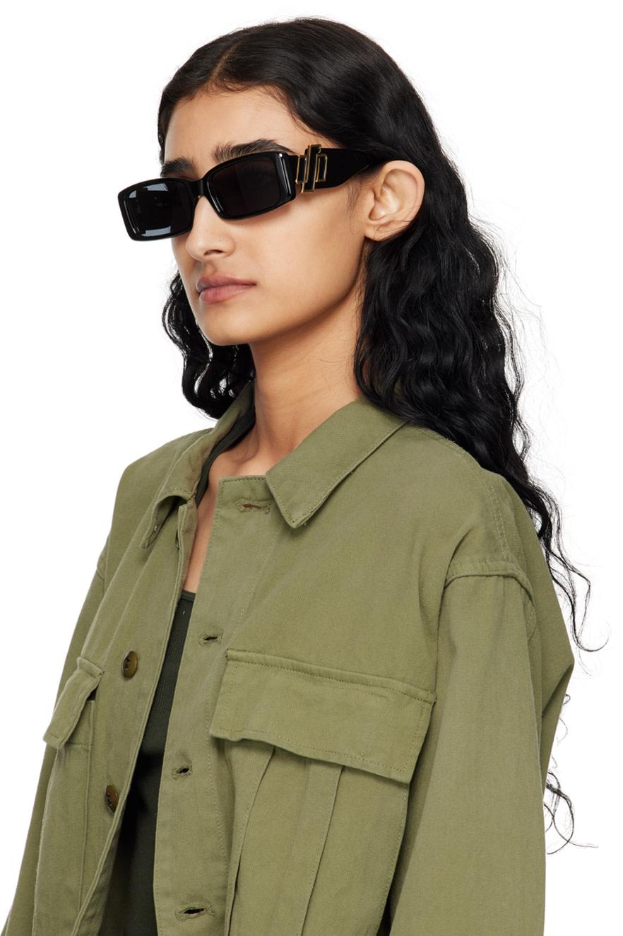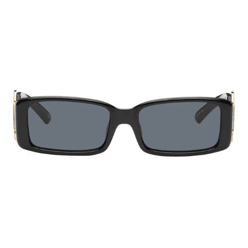 Rectangular lightweight BPA-free Ecozen® polymer-frame sunglasses in black. · Shatterproof and scratch-resistant gray lenses · 100% UVA/UVB protection, Category 3 · Integrated nose pads · Logo hardware at temples · Includes pouch · Size: 56.18 145