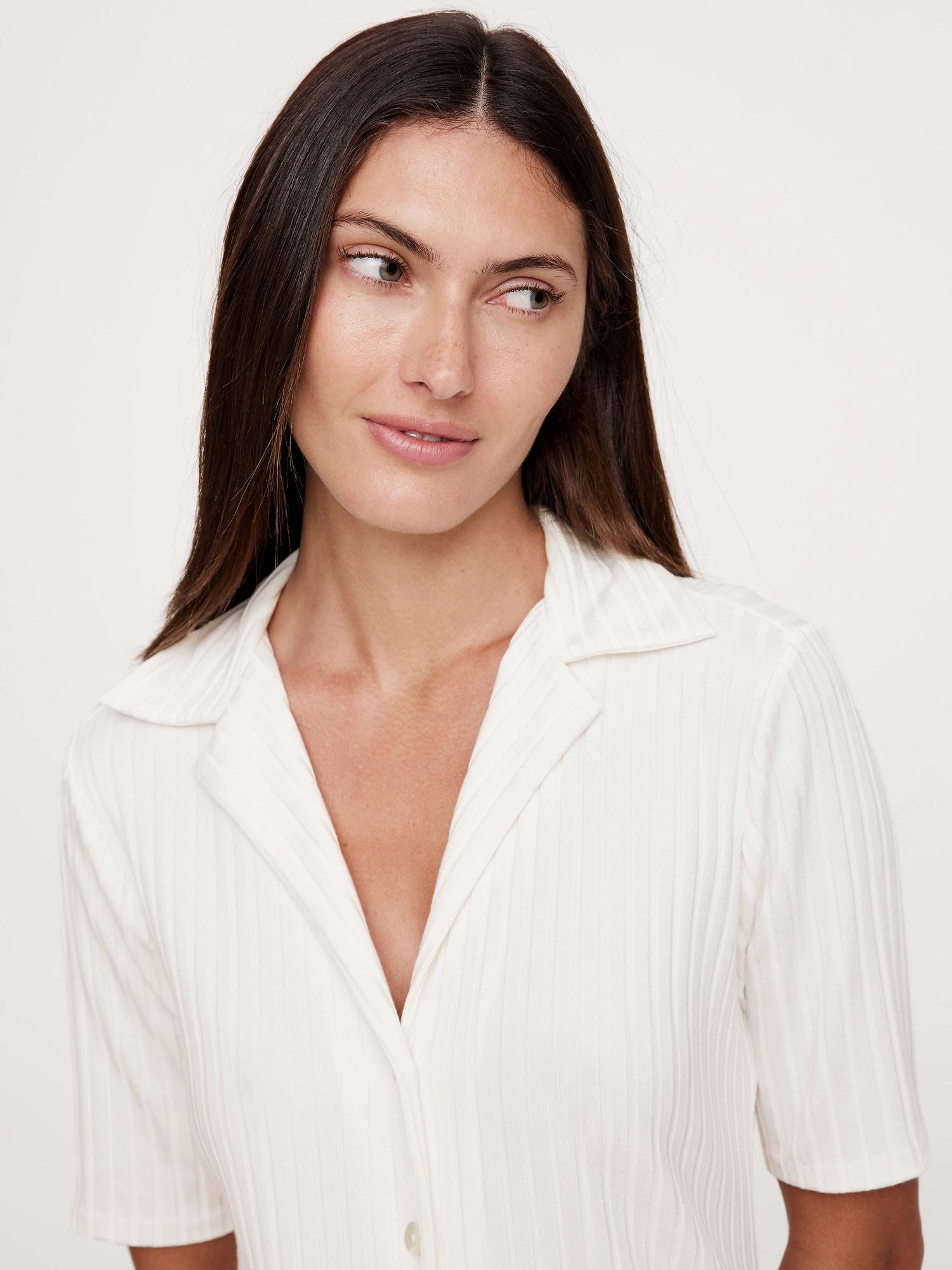An ode to styles from the 1990s, this slinky resort shirt is cut from our new ribbed-knit fabric, one we love for its incredible softness and distinctive, wide-ribbed texture. Fitted. Resort collar with button front. Straight hem. Fitted. Short sleeves. Hip length. Model: Size S, 5'10" (178cm).