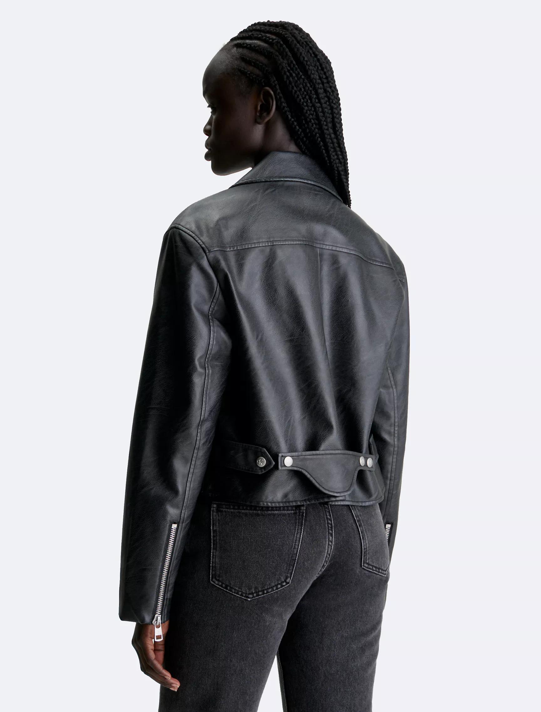 Timeless yet still at the forefront of trend cycles, few pieces can be considered as fundamental to the wardrobe as the classic leather jacket. Styled with drop shoulders for a slightly relaxed fit, this version is detailed with a point collar and snap buttons along the front. Finished with zip closures at the sleeve openings. Material: 60% Polyurethane, 40% Polyester.