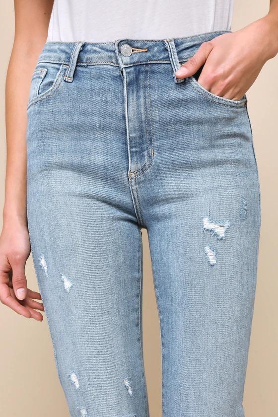 Freshen up your jeans-and-tees-'fits with the Just Black Extra Trendy Distressed Light Wash High-Waisted Slim Leg Jeans! Lightly stretchy denim shapes these cool, faded jeans with slim pants legs, distressing throughout, and a high-rise fit. Cropped raw hems. Five-pocket cut. Top button and hidden zipper fly. Fit: This garment fits true to size. Length: Ankle length. Size 28 Inseam: 28.00 Front Rise: 11.00 Waist: Fitted - stretchy fabric allows custom fit. Hip: Fitted - stretchy fabric allows room for hips. Fabric: Fabric has some stretch. Unlined. 93% Cotton, 5% Polyester, 2% Spandex. Machine Wash Cold. Dark Colors Separately. Do Not Bleach. Tumble Dry Low. Dry Cleaning Possible. Made with Love in the U. S.A. Lulus | Extra Trendy Distressed Light Wash High-Waisted Slim Leg Jeans | Size 24.