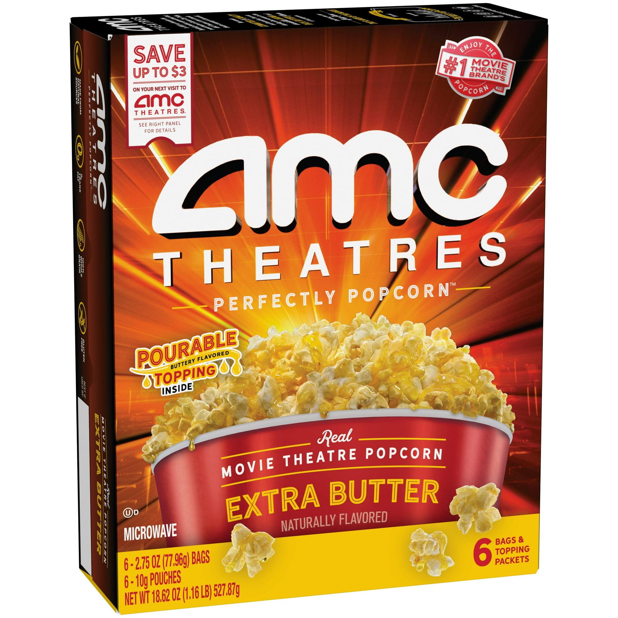 The ultimate at-home indulgence with bold movie theatre butter flavor and pourable buttery flavored topping Bring Home the Flavor of the Movies™ and get popping for all your snacking needs Made from natural sources, 0 grams trans fat, 100% whole grain and gluten-free; Contains Milk 40 calories per cup of popped corn Contains (6) 2.75 oz. bags of AMC Theatres Microwave Popcorn, Extra Butter. Also includes (6) 10g buttery topping packets