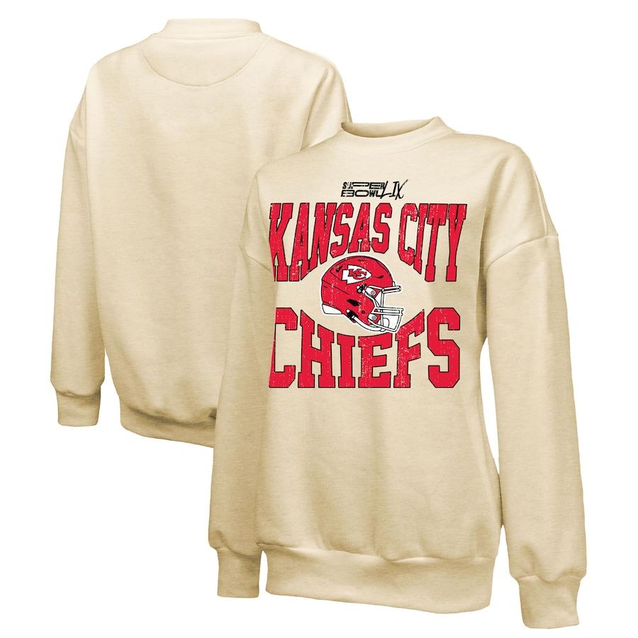 Women's Kansas City Chiefs Majestic Threads Cream Super Bowl LIX Fadeaway Helmet Oversized Tri-Blend Pullover Sweatshirt