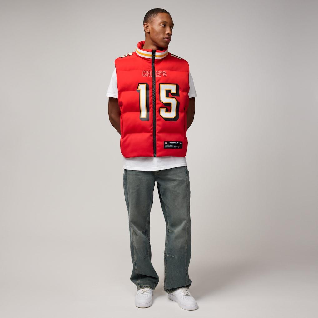 Don't miss out on the exclusive Off Season x NFL collab and grab this Kansas City Chiefs Player Puffer Vest before it's gone. This luxurious piece includes team name and logo embroidery, an NFL 3D silicone patch and hand-applied Patrick Mahomes graphics on the front and back, so you can represent your favorite Kansas City Chiefs player in style. Featuring corduroy lining with a padded polyester fill that provides exceptional insulation, an interior pocket and a water-resistant finish, this vest combines fashion and function to keep you warm and comfortable all game long.