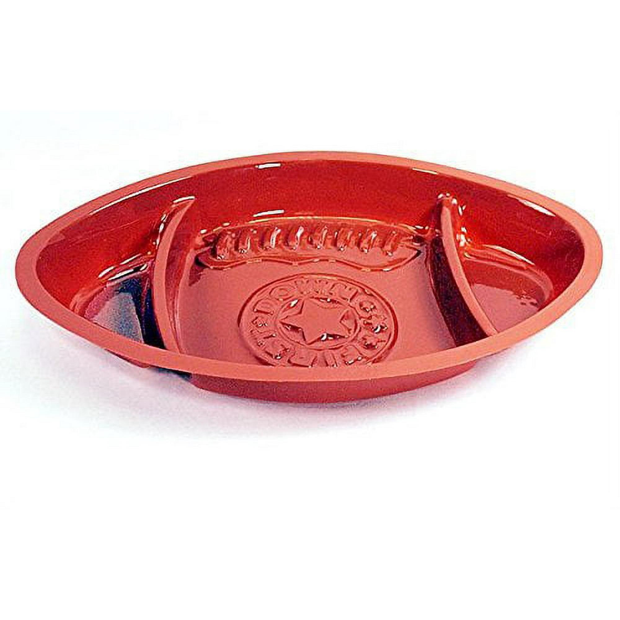 The football theme plates are large enough to use as a serving platter or as an individual plate. The end compartments are deep enough to use for condiments or dip and the whole tray is made of plastic so it can be washed and reused. The party snack trays are not intended for use in the microwave and it is recommended that they be washed before use. Center raised imprint reads First Down. Three Sections. Length: 11-5/8 Inches. Width: 8-1/4 Inches. Height: 1-1/2 Inches. Color: Orange Copper