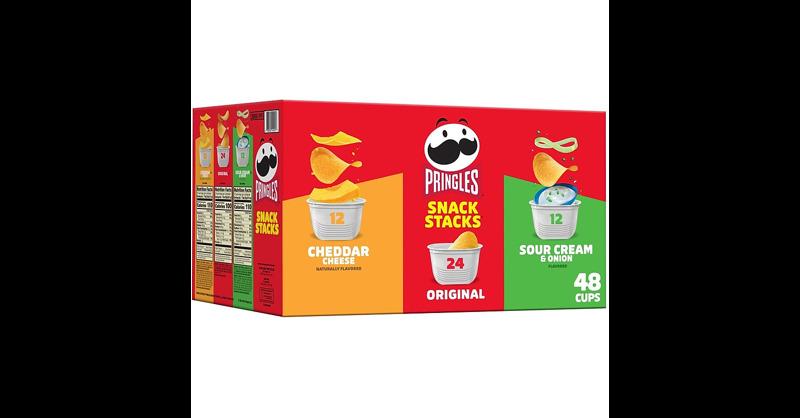 Discover the crisp, crunchy, hit-the-spot taste of potato in your choice of three delicious flavors. This Pringles Snack Stacks variety pack includes single-serve cups of Original, Cheddar Cheese, and Sour Cream & Onion flavors. Insanely light, crispy, and never greasy, they're bursting with salty, savory flavor. These conveniently sized small cups make it easy to grab and go. Create snacking moments wherever and whenever. Grab a cup as a pick-me-up for after school, or pack it into school lunch boxes. Bring these portable snacks to game time and pack a few for other Pringles fans. Stash this anytime snack in your pantry or work desk to enjoy anytime. Share the variety pack at your next cookout or BBQ to turn up the flavor and fun among family and friends. Get your hands on Pringles potato crisps for enticing flavor options that keep you coming back, stack after stack. . Grab-and-go sized variety pack of three delicious potato crisps flavors: Original, Cheddar Cheese, and Sour Cream & Onion. 48 cups per carton. Net weight: 0. 67 oz. (24 cups) and 0. 74 oz. (24 cups). Serving size: one cup. Single-portion cups pack perfectly into school lunch boxes, backpacks, or tote bags; easy and portable anytime snack. Pack includes: 12 cups of Sour Cream & Onion, 24 cups of Original, and 12 cups of Cheddar Cheese potato crisps. Always tasty, never greasy snacks. Contains milk and wheat ingredients
