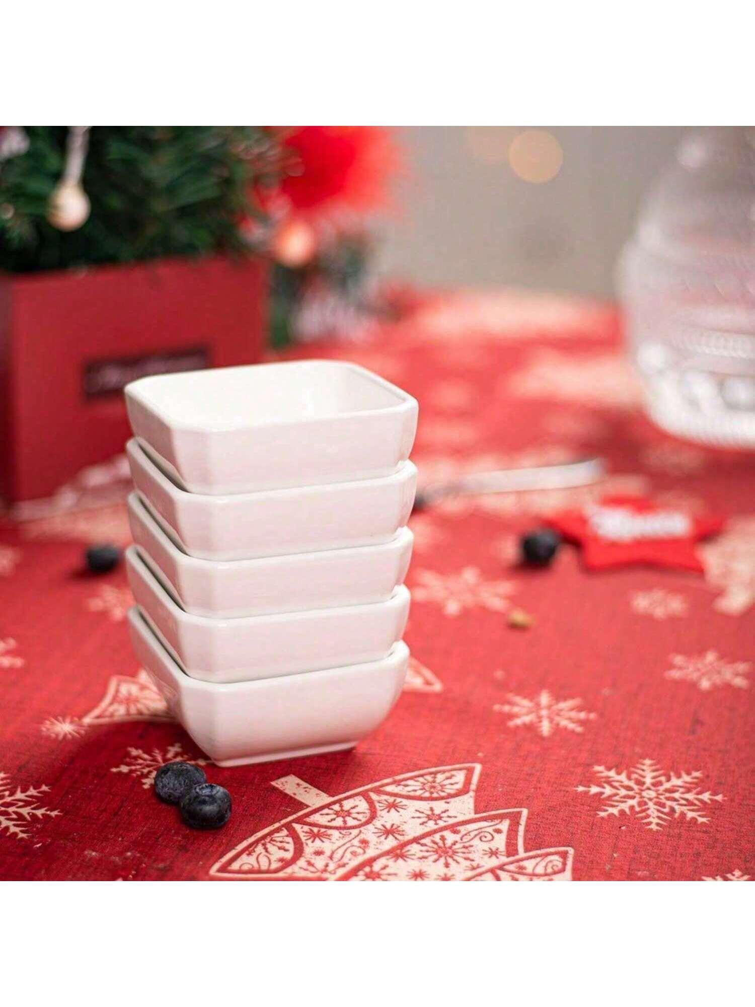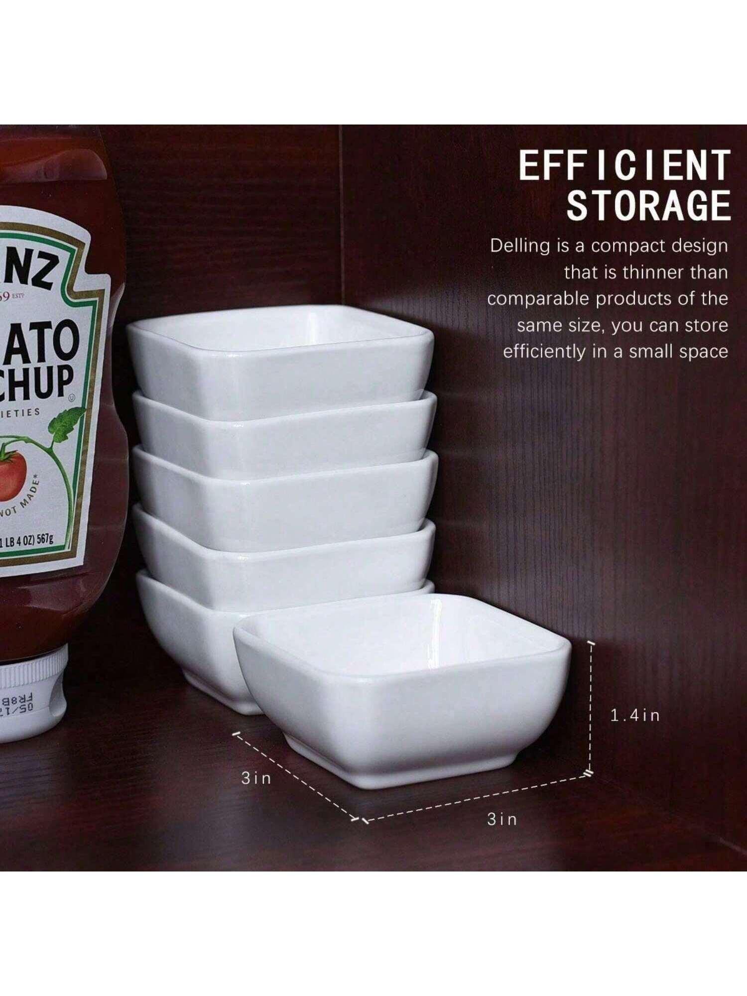 Healthy & Easy to Clean - Each dipping sauce bowls has passed the US kitchen safety with certification, protecting everybody healthy. These condiment cups are easy to clean and lasting clean without the residual odor of the food. Sauce dish must be subjected to rigorous high-temperature testing to ensure it can withstand the oven, microwave. Safe temperature up to 590°F and resistance than other glass or plastic dipping sauce dishEfficient Storage and Stackable - 3 X 3 inch sauce bowls can store efficiently in a small space and easily place small bowl on your chicken plates, not like others large bowls, compact design serving dips chip, ketchup, soy, appetizer and chocolate syrup, fried shrimp paste as appetizer dishes, individual oil dip. Perfectly paired with other parties serveware.A little Family Dinner Helper - You won't easily turn over the sauce because of the stable with round bowl bottom. It's very practical, firm tiny dipping bowls with robust square base are of kids food. A gift for the chef to organizing custard, crackers spices or olive prep.