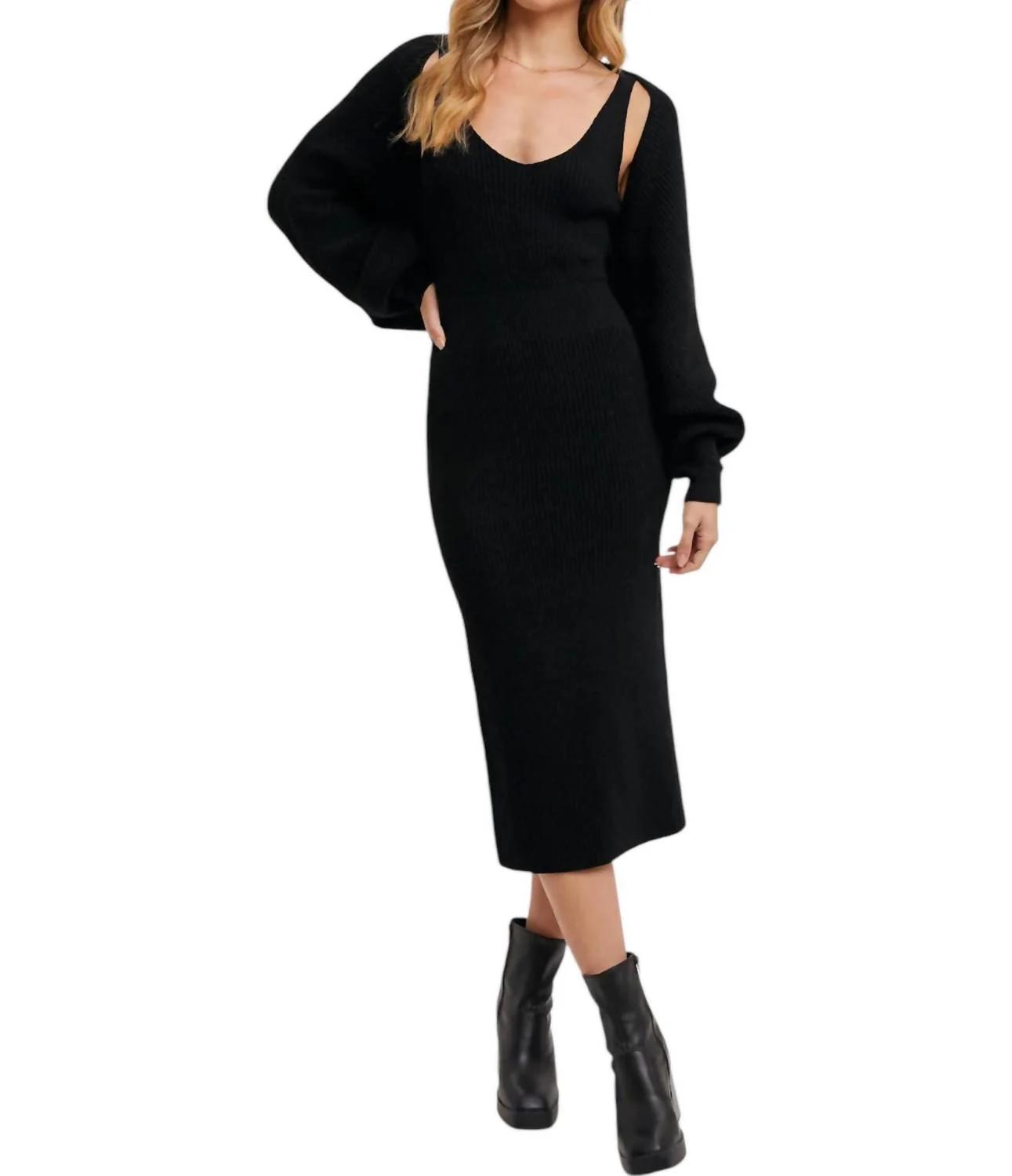 V-Neck Knit Midi Dress And Knit Shrug Set In Black