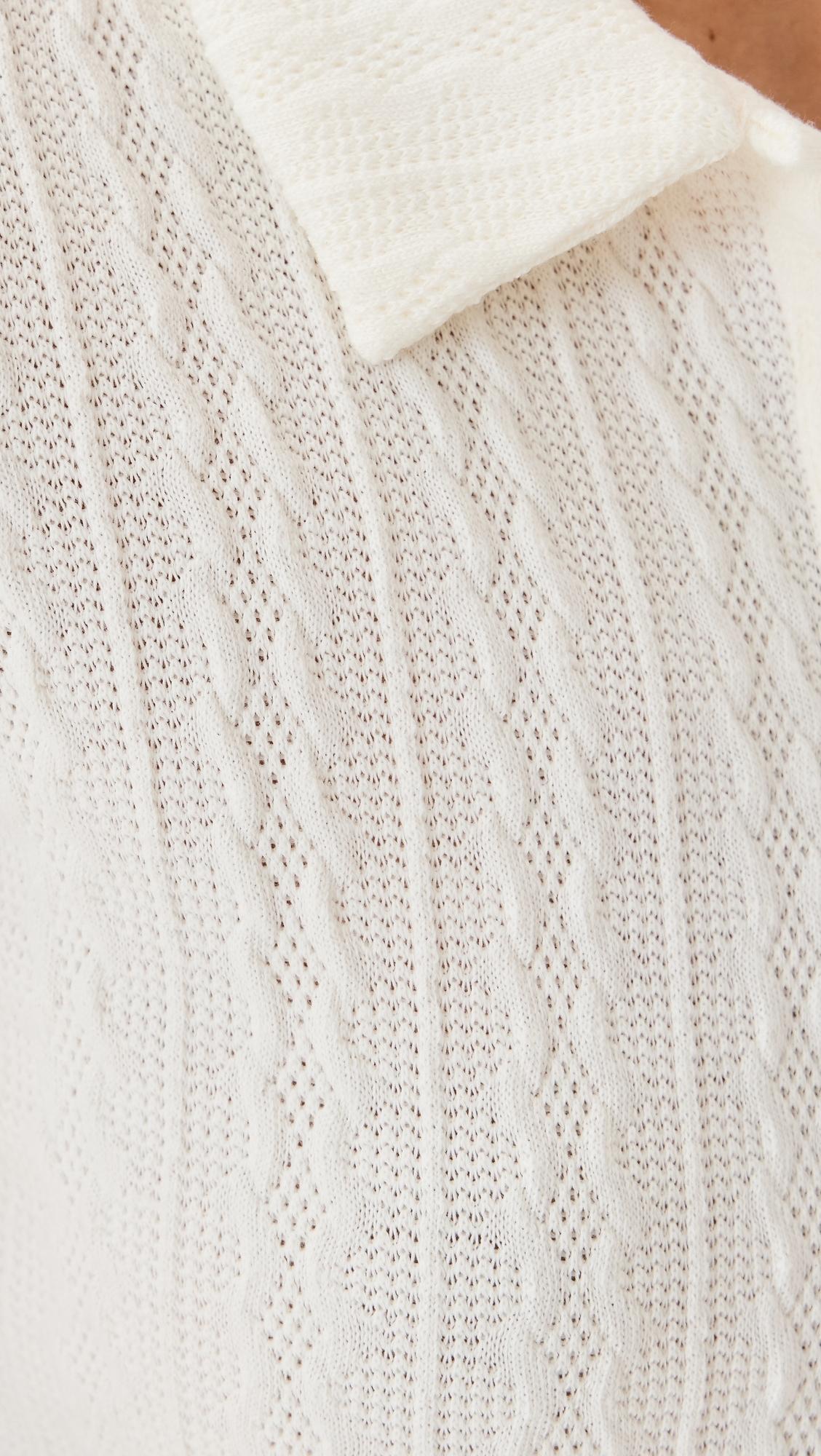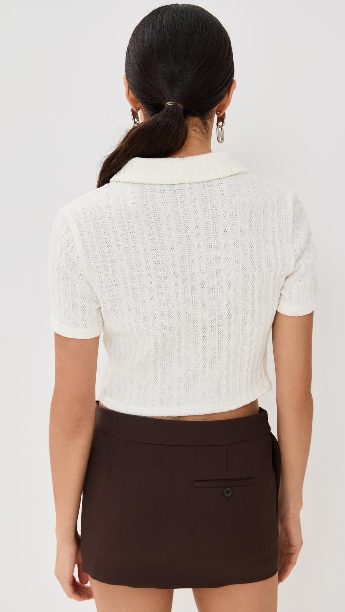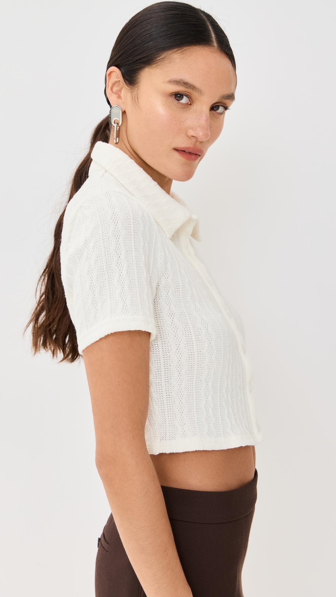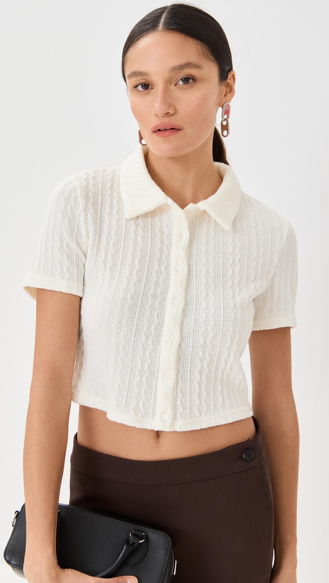 Fabric: Mid-weight textured knit. Cropped length. Collared neck. Short sleeves. Button placket. Shell: 97% polyester/3% elastane. Hand wash. Imported, China. Measurements: Measurements from size S Length: 16.25in / 41.0cm, from shoulder