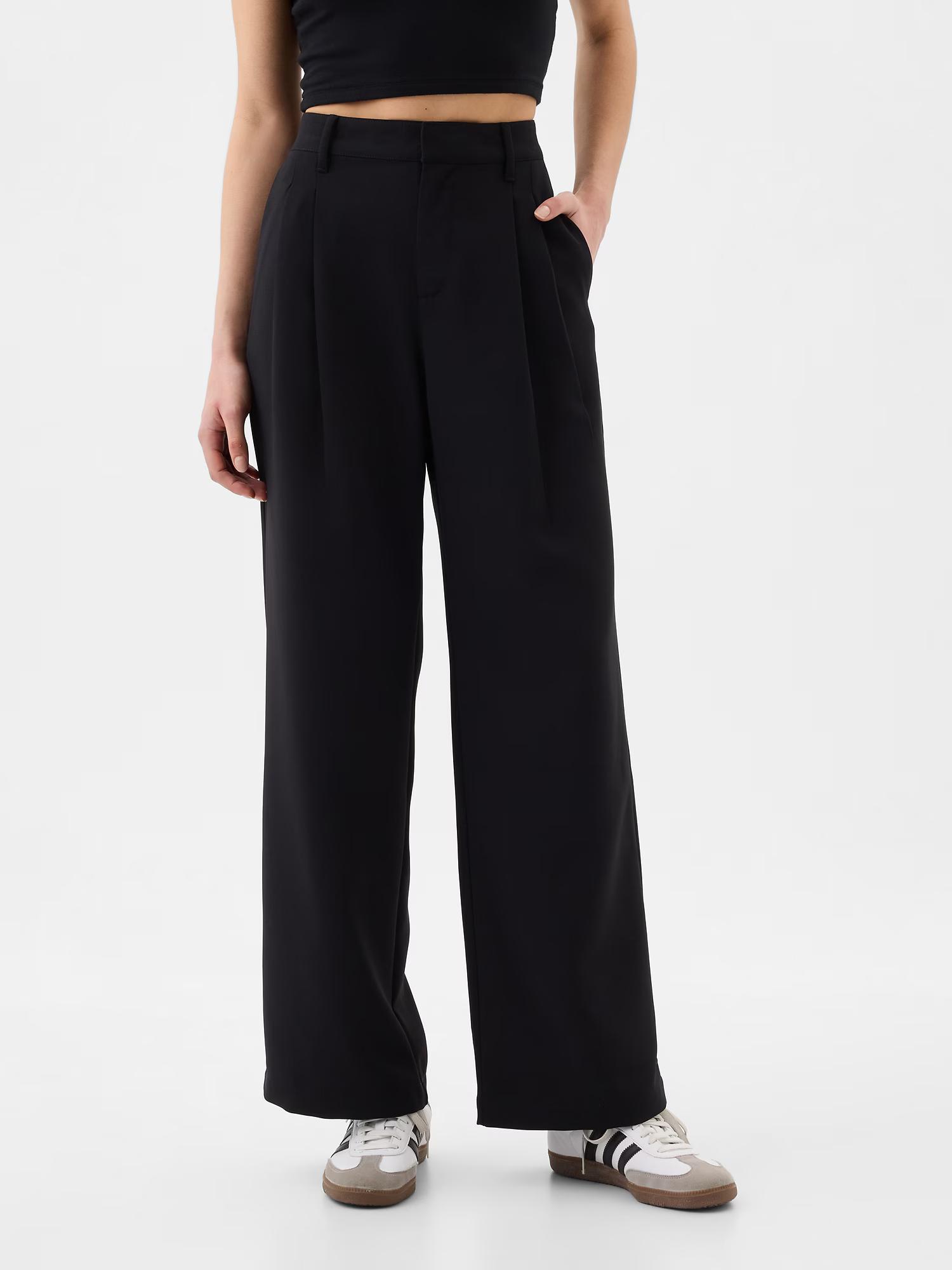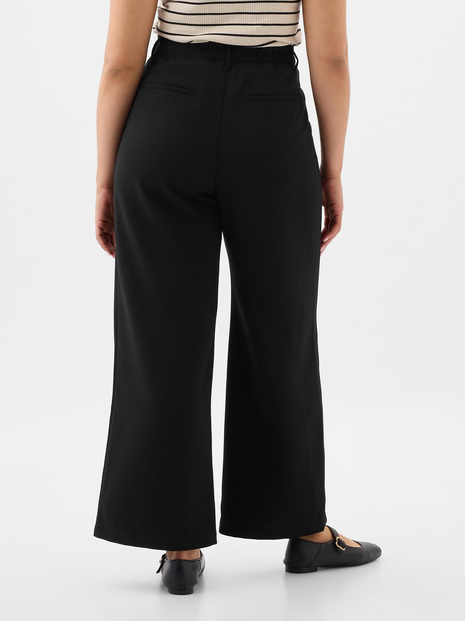 Smooth crepe weave. Elasticized waist at back. Hook and bar closure, zip fly. Front slant pockets, welt pockets at back. Pleated at front. High waisted. Easy through the hip and thigh. Loose, straight leg. Inseam: 30"